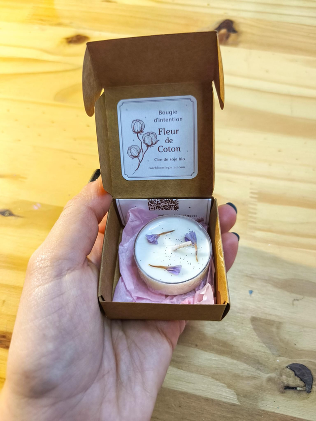 – Une bougie d’intention “Fleur de coton”, au parfum lacté et irisé (cire de soja bio, fragrances élaborées par un artisan parfumeur avec des parfums de Grasse), créée par Rose dans son atelier, artisane cirière et co-fondatrice de la boutique holistique Crystal Bloom à Palaiseau.